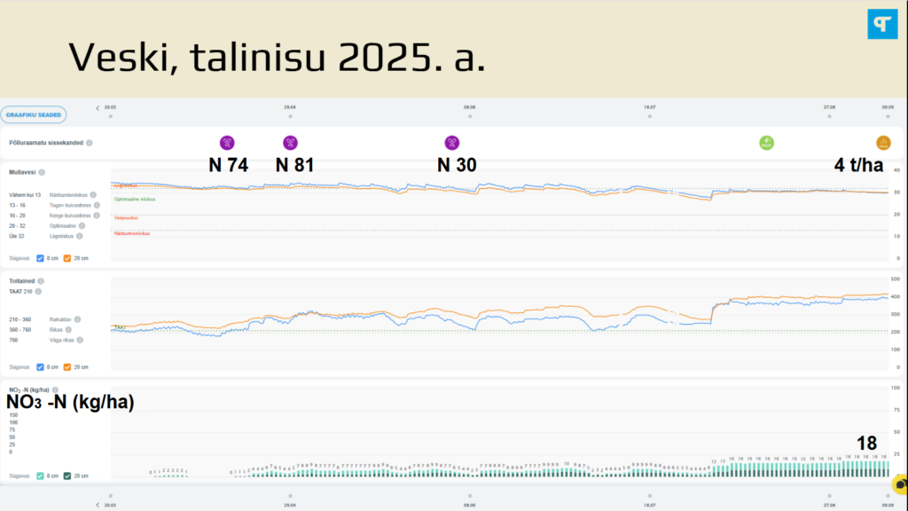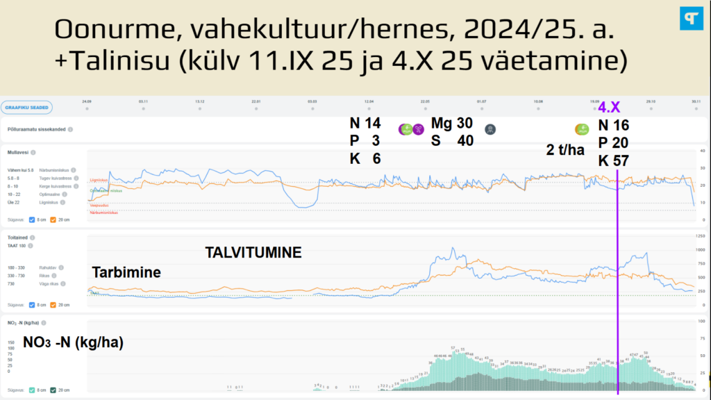 Õnneks see lämmastik pärast koristust kuhugi ei kadunud ning sain järgnevat kultuuri silmas pidades teha otsuse, et mul pole vajalik lämmastikväetist külvi alla lisada. Graafikut vaadates jõudis toitainete tase väetamiseelsele tasemele 24. detsembril 2025 – ehk otsus oli minu hinnangul õige.